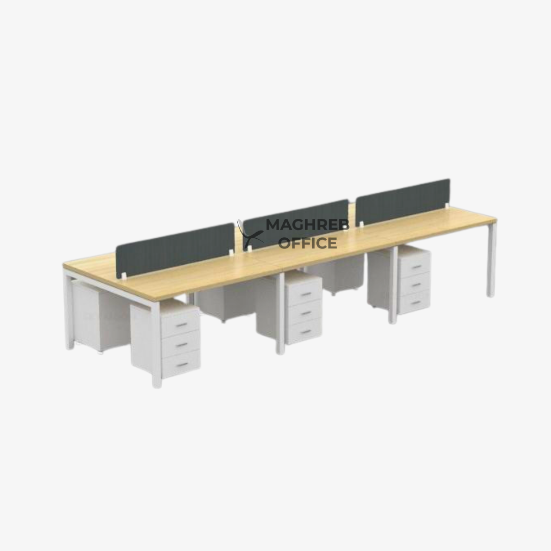 Le bench open space se distingue par ses finitions claires et son design épuré. Il apporte de la luminosité aux espaces de travail, contribuant à une atmosphère plus agréable et productive au quotidien.